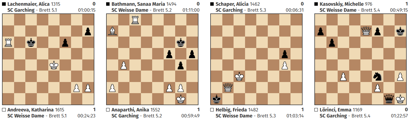15:55 Uhr: Michelle hat urplötzlich wieder zugeschlagen und ihre Gegnerin mattgesetzt. 1:0 Bei Saana und Frieda sind wohl keine Punkte mehr zu erwarten, dafür verbessert Katharina ihre Stellung.