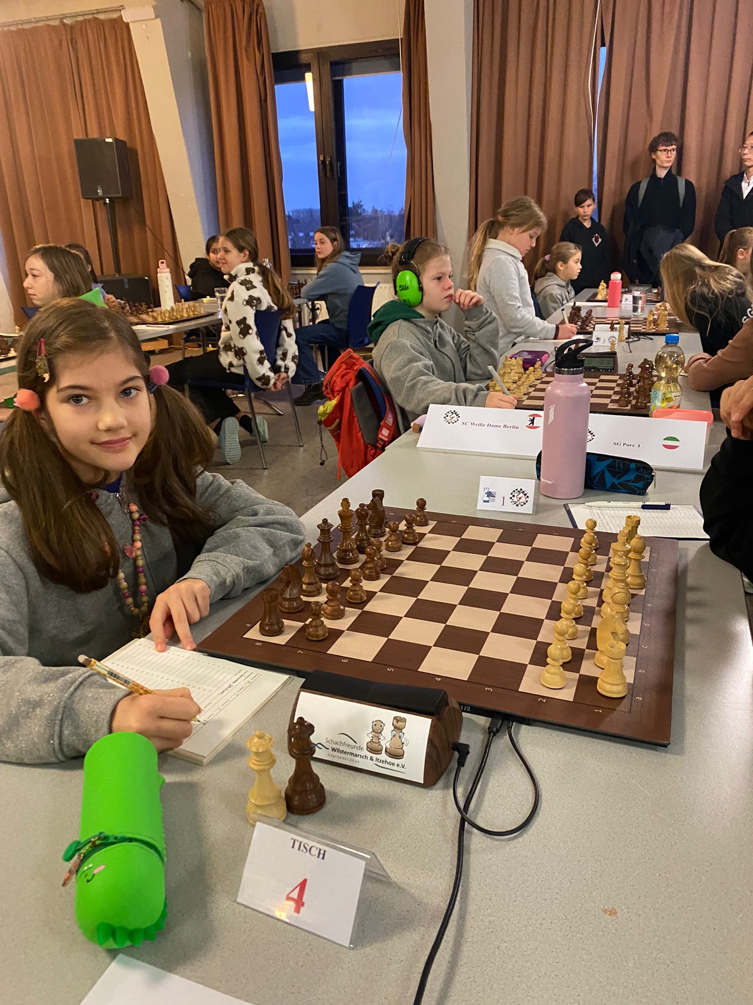 Ladies first: In der Altersklasse u12w sind wir bereits zum 5. Mal in Folge dabei. Als Betreuer fungiert unser Jugendwart Johannes. Das Turnier findet diesmal in Neumünster (in der Mitte von Schleswig-Holstein gelegen) statt. Im Vergleich zur Norddeutschen Meisterschaft ist leider Mara nicht dabei, dafür spielt neben Katarina, Frieda und Gastspielerin Sanaa (aus Falkensee) nun an Brett 4 Michelle erstmals bei einer überregionalen Meisterschaft mit. Nach der Setzliste sind wir auf Platz 15 von 20 Teams eingeordnet.